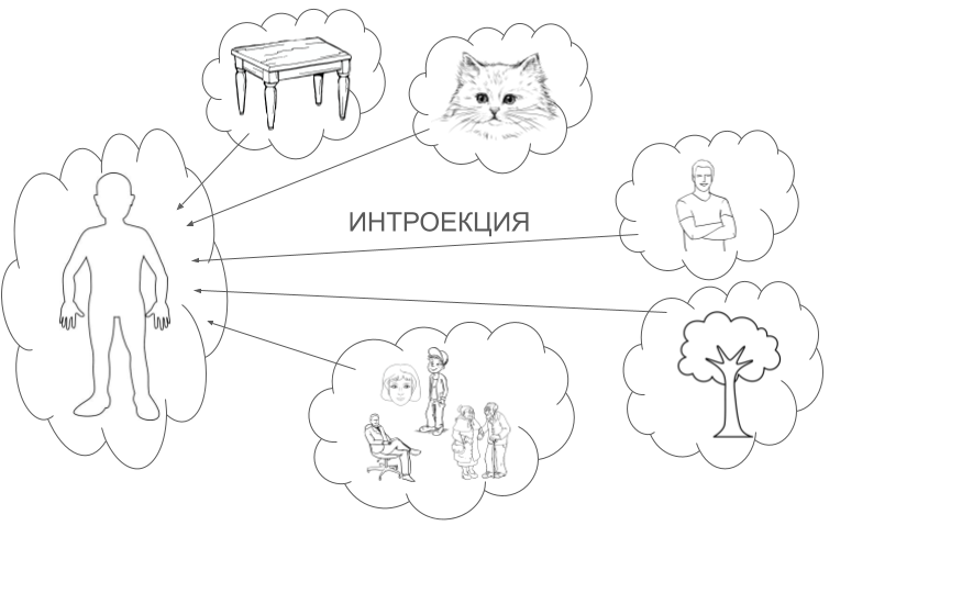 Один из единомышленников З.Фрейда, венгерский психоаналитик Шандор Ференци, создал учение об интроекции (1909). Этот термин описывает тот-же психический механизм, что и в проекции, но с обратным вектором. Когда личность, на бессознательном для себя уровне, проецирует на себя нечто внешнее. Это могут быть ценности, установки, особенности поведения других людей (интроекции) (Рис.2).