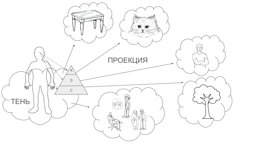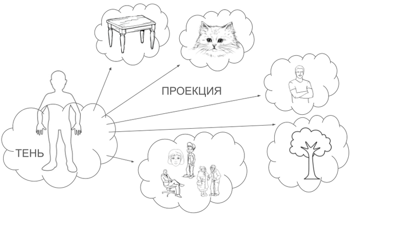 Для наглядности я перенес данный смысл на рисунок (Рис.1). Под «ТЕНЬЮ» понимается вытесненная сторона личности, то есть то, кем личность быть не хочет настолько, что отрицает эти качества в собственном осознании.