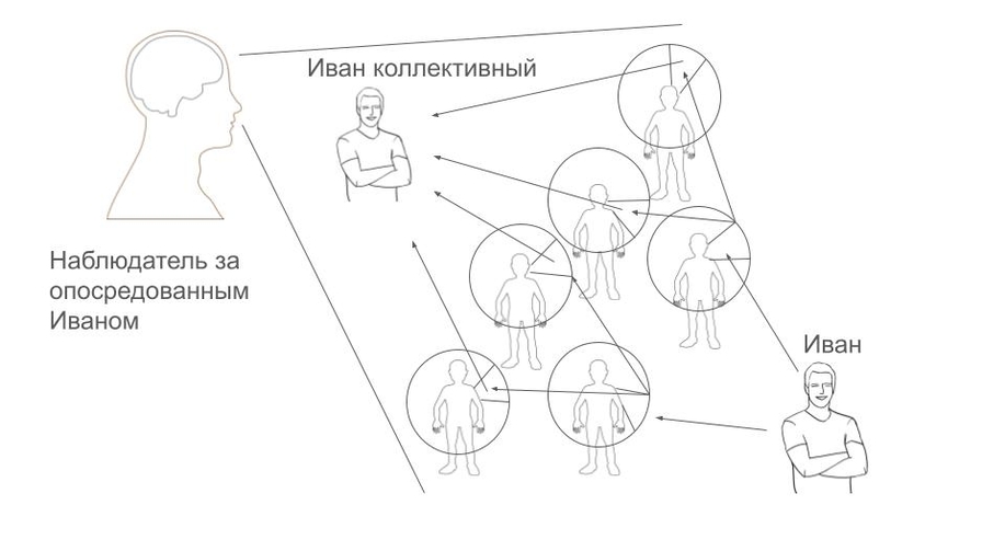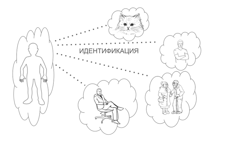 Можно сказать, что идентификация происходит так, как будто мы переносим свое сознание в тело другого человека (или объекта) или наоборот, одеваем тело и сознание другого человека (или объекта) на свое собственное, как бы отождествляясь с ним, смешивая свою субъективность с его субъективностью.