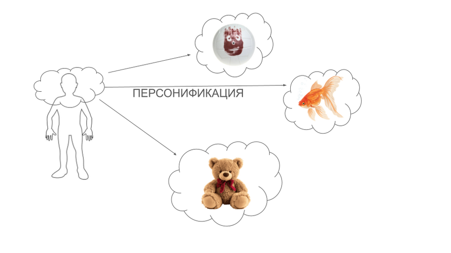 Американский психолог, последователь психоанализа З.Фрейда, основатель интерперсонального психоанализа Гарри Салливан, использовал термин «ПЕРСОНИФИКАЦИЯ» для описания такой психологической проекции, когда неодушевленным предметам, природным явлениям и силам приписываются человеческие свойства (Рис.4).